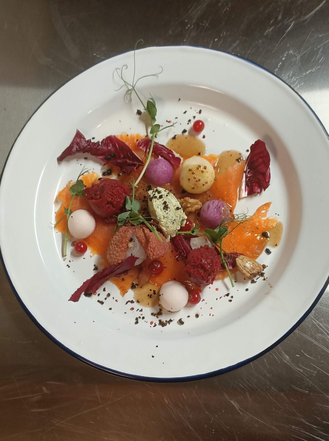 Afin de pouvoir créer sans contrainte et vous faire plaisir, je vous prépare un menu dégustation composé d’une entrée, plat et fromage ou dessert qui évolue au fil des saisons et de ma complicité avec mes petits producteurs locaux. Menu unique que vous découvrirez au fur et à mesure de votre repas (au moment de votre réservation veuillez nous indiquer les éventuelles allergies ou ce que vous n’aimez vraiment pas)